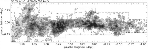 Figure 1.4. Map of integrated CS J = 1–0 line emission, showing the spatial extent of relatively dense clouds in the CMZ, as measured by the 45-m telescope of the Nobeyama Radio Observatory (from Tsuboi et al 1999).
