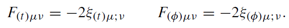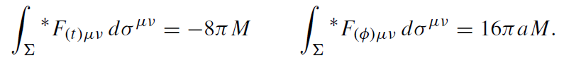 Here ∗F(t)μν = Ɛμναβ Fαβ. Thus, the axial Killing vector ξ(φ) generates a stationary, axisymmetric field, which asymptotically approaches a uniform magnetic field and, moreover, has electric charge 4aM. The timelike Killing vector ξ(t ) generates a stationary, axisymmetric field, which vanishes at infinity and has electric charge −2M.