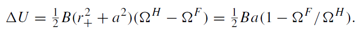 where d l is the distance element along a meridian of the black hole surface and ΔUH is the difference between the values of UH on the equipotentials 1 and 2. The approximate equality is valid if ΩF ≈ ΩH /2, maximal ΩH, and the equipotentials 2 and 1 corresponding to the equatorial and polar regions, respectively.