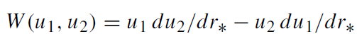 They are known as IN and UP modes, respectively. The complex conjugates of these solutions are also solutions of the radial wave equation. They are known as OUT and DOWN modes, respectively. For any two solutions u1 and u2 the Wronskian