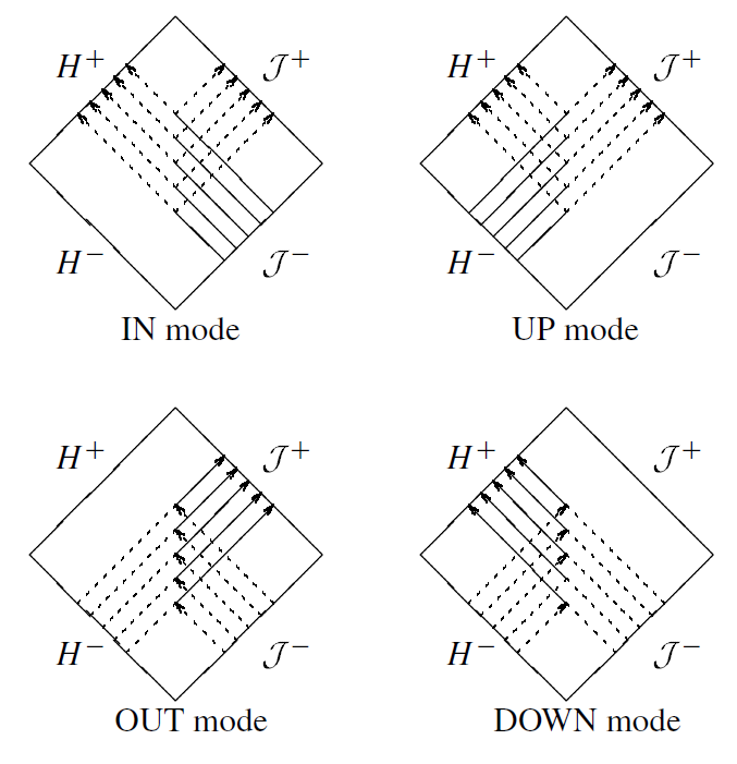 Thus, in this solution, there is radiation coming in from infinity, radiation emerging from H− to meet it, and radiation going down the black hole at H+. The amplitudes of the various waves are such that down is an acceptable solution to the radial wave equation. The UP mode is defined analogously by the boundary condition that there be no incoming radiation from infinity. In a similar way the IN solution does not contain radiation outgoing from H−, while the OUT mode has no radiation going down the black hole at H+. The situation is presented graphically in figure 1.3.