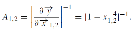 where x1,2 and y are measured in terms of θE and where x2 < 0 by definition. Gravitational lensing conserves surface brightness, and so the magnifications A1,2 in the flux of each image relative to that of the unlensed source are proportional to change in the angular area of the source,