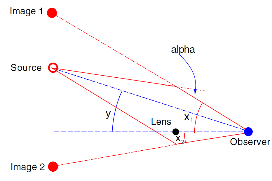 The relation between the angular position of the source relative to the observer-lens axis (the optical axis) can be derived from the geometry of the light paths,