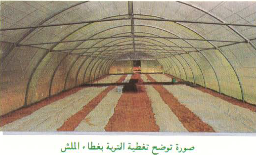 يجب تغطية التربة في البيوت المحمية بغطاء يسمى (الملش) وهو غطاء ملون باللون الابيض الفضي من الاعلى واللون الاسود من الاسفل مع ملاحظة عند فرد غطاء الملش فوق الخطوط ان يكون لون الملش الاسود الى الاسفل والفضي الى اعلى ولهذا الغطاء فوائد عده هي: