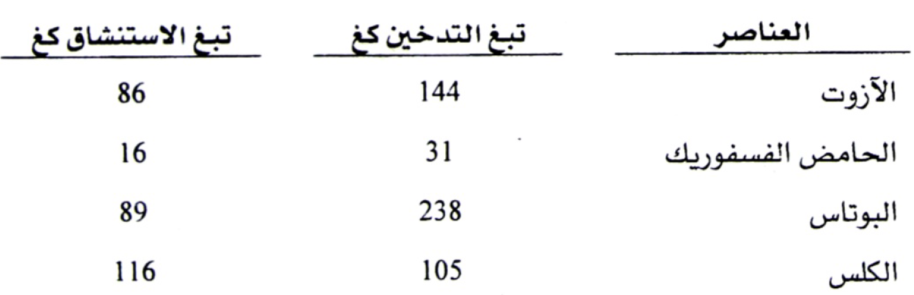 أثبت الكيميائيون أن التبغ محصول مجهد شره يتطلب العناصر الغذائية أكثر من معظم المحاصيل الحقلية، وقد وجدوا العناصر الآتية أسماؤها ومقاديرها في محصول قدره 1918 كغ من الورق اليابس المعد للتدخين وفي محصول آخر " قدره 1069 كغ من الورق اليابس المعد للاستنشاق (العطوس).