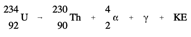 The combined kinetic energy of the daughter nucleus (Thorium-230) and the α particle is designated as KE. The sum of the KE and the gamma energy is equal to the difference in mass between the original nucleus (Uranium-234) and the final particles (equivalent to the binding energy released, since m = BE). The alpha particle will carry off as much as 98% of the kinetic energy and, in most cases, can be considered to carry off all the kinetic energy.