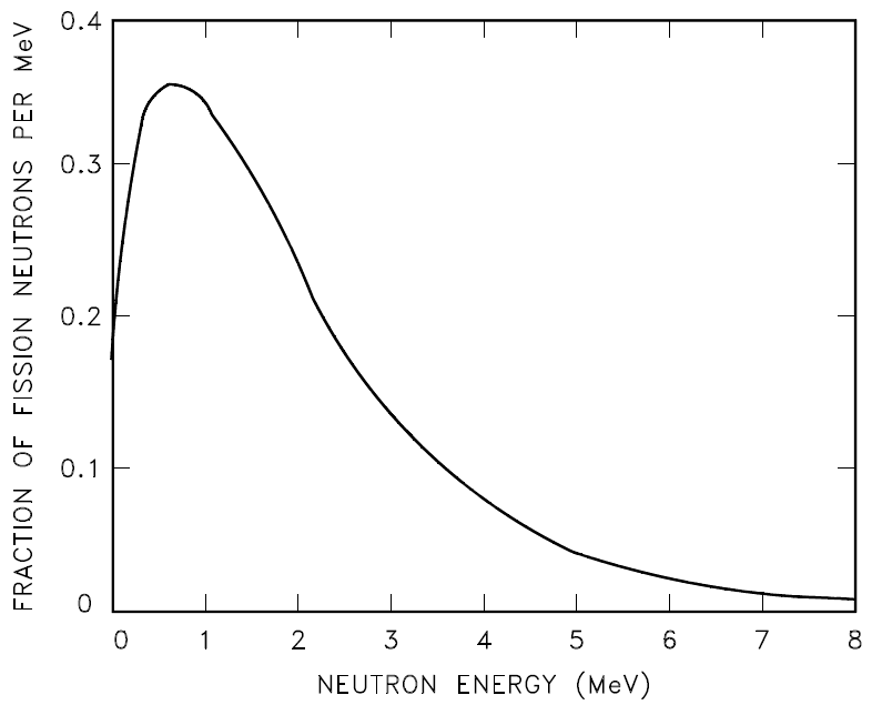 The neutrons produced by fission are high energy neutrons, and almost all fission neutrons have energies between 0.1 MeV and 10 MeV. The neutron energy distribution, or spectrum, may best be described by plotting the fraction of neutrons per MeV as a function of neutron energy, as shown in Figure 1. From this figure it can be seen that the most probable neutron energy is about 0.7 MeV. Also, from this data it can be shown that the average energy of fission neutrons is about 2 MeV. Figure 1 is the neutron energy spectrum for thermal fission in uranium-235. The values will vary slightly for other nuclides.