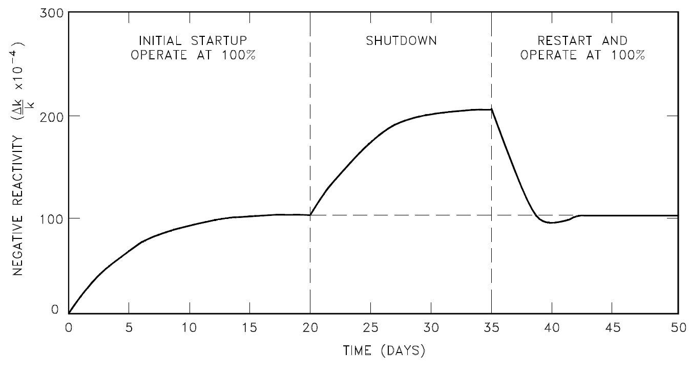 Because samarium-149 is not radioactive and is not removed by decay, it presents problems somewhat different from those encountered with xenon-135, as illustrated in Figure 1. The equilibrium concentration and the poisoning effect build to an equilibrium value during reactor operation. This equilibrium is reached in approximately 20 days (500 hours), and since samarium-149 is stable, the concentration remains essentially constant during reactor operation. When the reactor is shutdown, the samarium-149 concentration builds up as a result of the decay of the accumulated promethium-149. The buildup of samarium-149 after shutdown depends upon the power level before shutdown. Samarium-149 does not peak as xenon-135 does, but increases slowly to a maximum value as shown in Figure 1. After shutdown, if the reactor is then operated at power, samarium-149 is burned up and its concentration returns to the equilibrium value. Samarium poisoning is minor when compared to xenon poisoning. Although samarium-149 has a constant poisoning effect during long-term sustained operation, its behavior during initial startup and during post-shutdown and restart periods requires special considerations in reactor design.