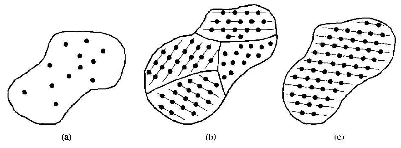 Figure 1.1 I Schematics of three general types of crystals: (a) amorphous, (b) polycrystalline, (c) single crystal.