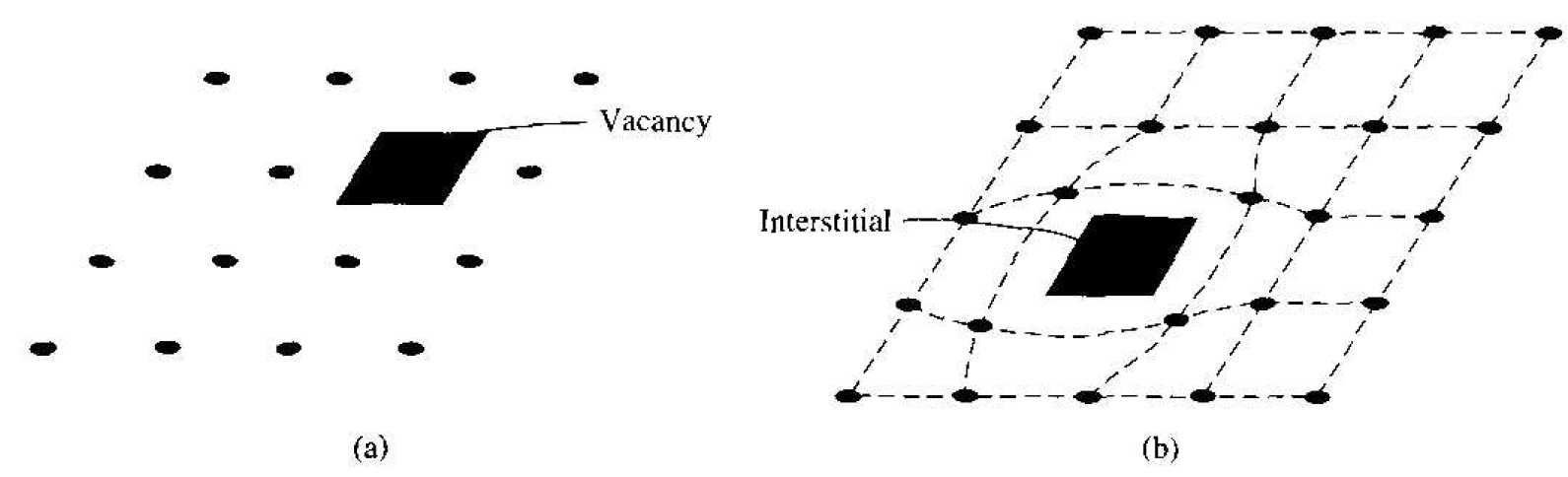 Figure 1.1 Two-dimensional representation of a single-crystal lattice showing (a) a vacancy defect and (b) an interstitial defect.