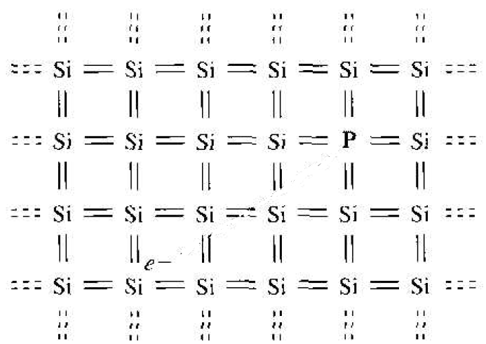 If a small amount of energy, such as thermal energy. is added to the donor electron, it can be elevated into the conduction band, leaving behind a positively charged phosphorus ion. The electron in the conduction band can now move through the crystal generating a current, while the positively charged ion is fixed in the crystal. This type of impurity atom donates an electron to the conduction band and so is called a donor impurity atoms. The donor impurity atoms add electrons to the conduction band without creating holes in the valence band. The resulting material is referred to as an n-type semiconductor (n for the negatively charged electron).