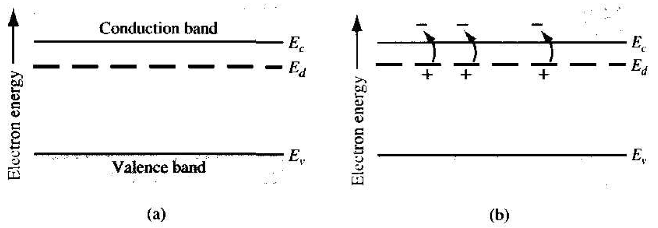 Figure 1.3 The energy-hand diagram showing (a) the discrete donor energy state and (b) the effect of a donor state being ionized.