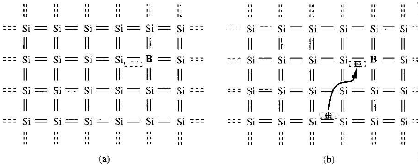 Now consider adding a group III element, such as boron, as a substitutional impurity to silicon. The group III element has three valence electrons, which are all taken up in the covalent bonding. As shown in Figure 1.4a, one covalent bonding position appears to be empty. If an electron were to occupy this "empty" position. Its