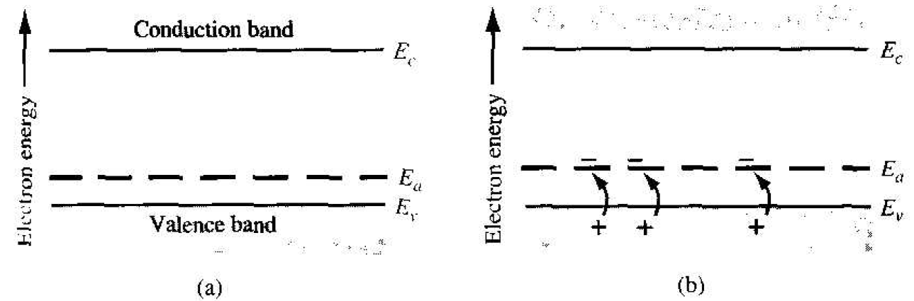 Figure 1.5 The energy-band diagram showing (a) the discrete acceptor energy state and (b) the effect of an acceptor state being ionized.