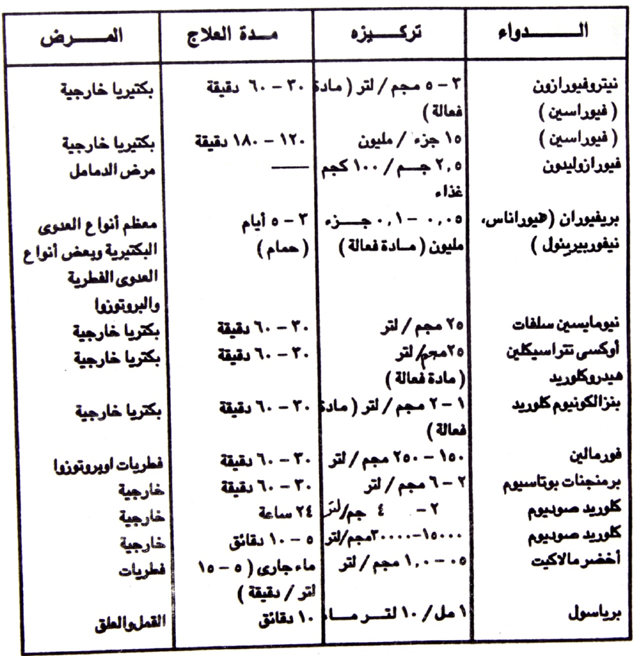 6- لا تجري المعالجة علي المستوي العام إلا بعد ١٢ - ٢٤ ساعة للتأكد من نجاح المعالجة المبدئية التجريبية علي العدد البسيط من السمك.