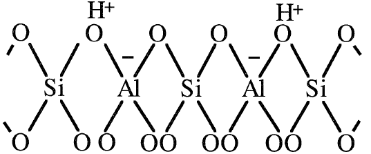 The four oxygen anions in the tetrahedron are balanced by the +4 oxidation state of the silicon cation, while the four oxygen anions connecting the aluminum cation are not balanced. This results in –1 net charge, which should be balanced. Metal cations such as Na+, Mg2+, or protons (H+) balance the charge of the alumina tetrahedra. A two dimensional representation of an H-zeolite tetrahedra is shown: