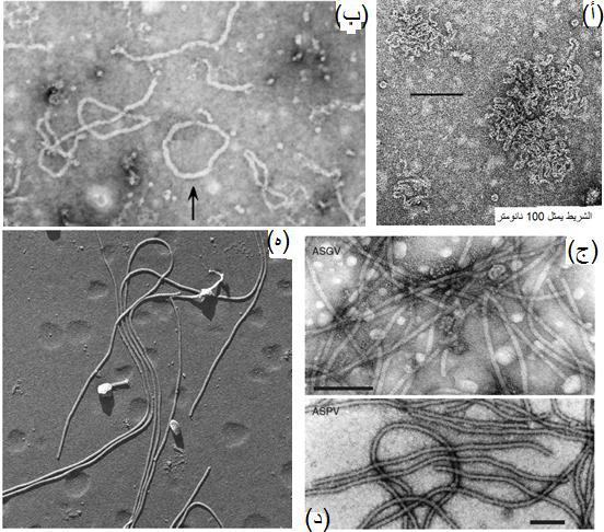 الشكل(2). الجسيمات العصوية المرنة المصورة بالمجهر الالكتروني لخمسة أنواع من الفايروسات هي (أ) اجسام خيطية غريبة لفايروس غير مشخص يعود للجنس Ophiovirus معزول من نباتات خس (ب) فايروس الورقة البيضاء للرز(RHBV) (ج) فايروس تشقق ساق التفاح (ASGV) (د) فايروس تنقر ساق التفاح (ASPV) (ه) جسيمات فايروس البطاطا واي (PVY) المصورة بالمجهر الالكتروني الماسح ووجود جسيمة من الفاج البكتيري لغرض المقارنة الحجمية (الشريط في الشكلين ج و د = 100 نانومتر).
