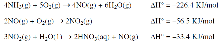 Nitric acid is commercially produced by oxidizing ammonia with air over a platinum-rhodium wire gauze. The following sequence represents the reactions occurring over the heterogeneous catalyst: