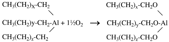 The oxidation of triethylaluminum is carried out between 20–50°C with “bone dry” air to aluminum trialkoxides.