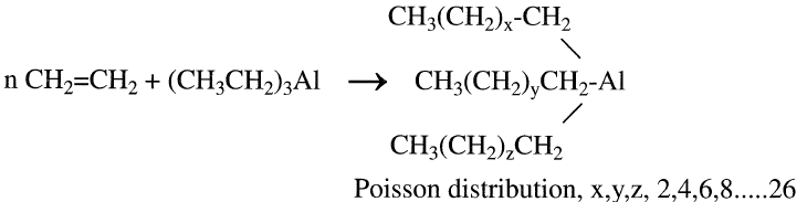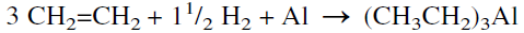 In the next step, ethylene is polymerized by the action of triethylaluminum at approximately 120°C and 130 atmospheres to trialkylaluminum. Typical reaction time is approximately 140 minutes for an average C12 alcohol production: