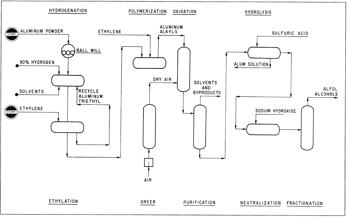 Linear alcohols (Cl2-C26) are important chemicals for producing various compounds such as plasticizers, detergents, and solvents. They are also produced by the oligomerization of ethylene using aluminum alkyls (Ziegler catalysts). The Alfol process (Figure 1.1) for producing linear primary alcohols is a four-step process. In the first step, triethylaluminum is produced by the reaction of ethylene with hydrogen and aluminum metal: