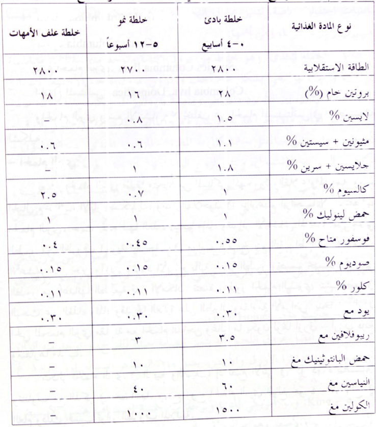 الجدول يوضح المتطلبات الغذائية في خلطات علف الفزان/ كغ