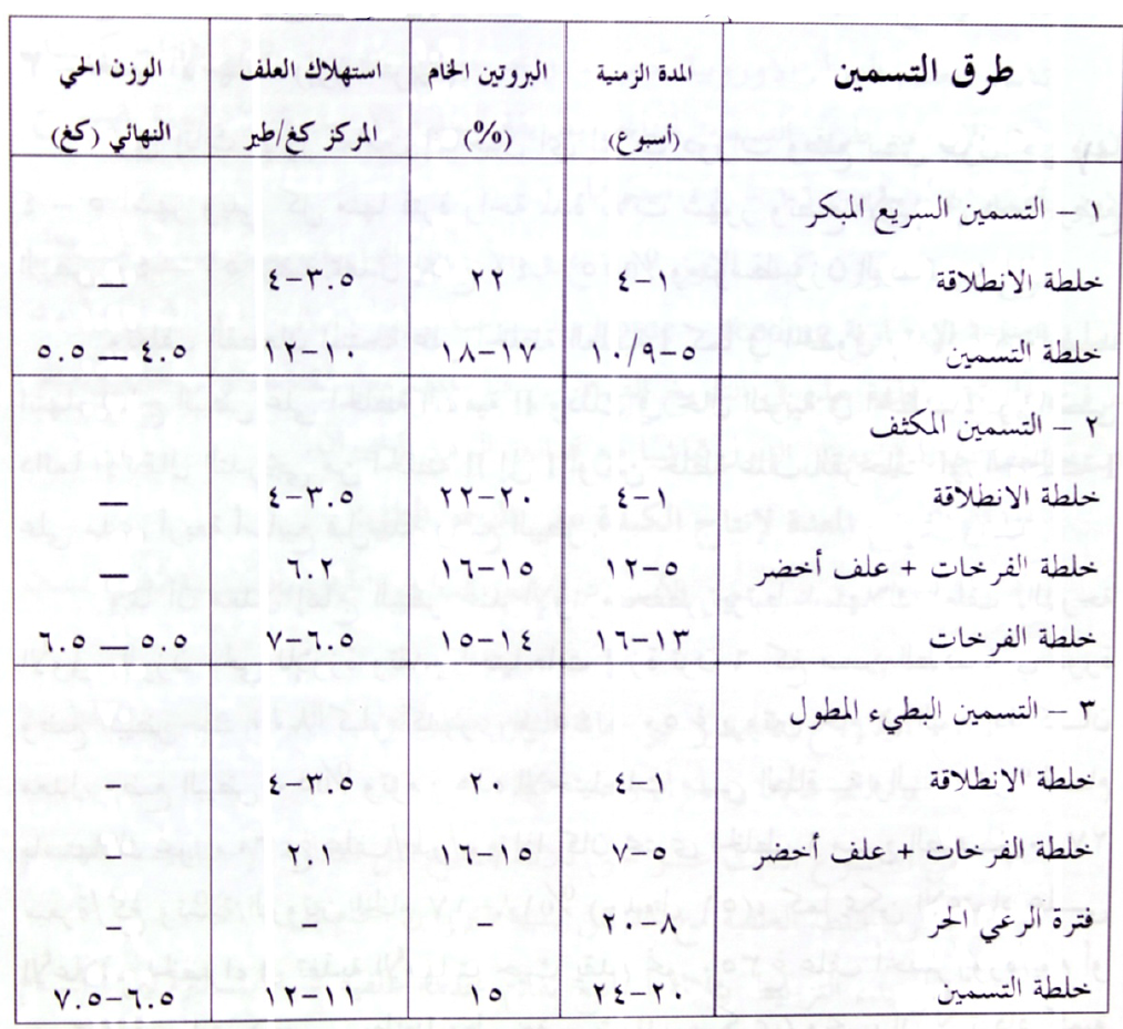 - التسمين المكثف: وفيه تسمن الفراخ لعمر 16 اسبوعاً يقدم للفراخ بعد الأسبوع الرابع مجروش الحبوب والعلف الأخضر و ٢غ مخلوط عناصر معدنية في اليوم تغذى كما هو الحال بالنسبة لفراخ التربية لهذا العمر. وفي الأسبوعين العاشر والحادي عشر يقدم لها مخلوط من مجروش الحبوب مع الخلطة الجاهزة مناصفة وذلك لضمان نمو الريش بعد القلش. وفي الأسبوع الثاني عشر يقدم لها ثانية مجروش الحبوب والعلف الأخضر حتى نهاية الفترة.