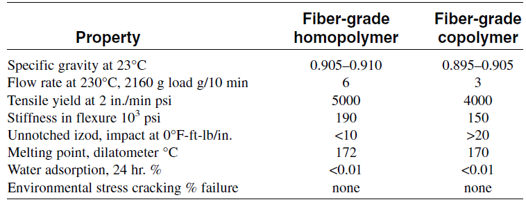 Crystallinity of fiber-grade polypropylene is moderate and when heated, it starts to soften at approximately 145°C and then melts at 170°C. The physical properties of fiber-grade polypropylene are given in Table 1.1.