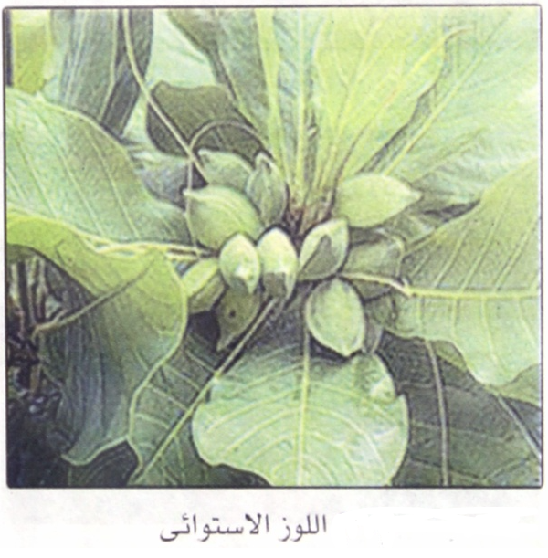 اللوز الاستوائي شجرة متوسطة الحجم، ارتفاعها ۱۳ - ۲۷ مترا، الأوراق بسيطة، جلدية لونها أخضر يتحول إلي الأحمر عند تساقطها، وتتساقط اوراقها مرتين في العام (في فبراير وسبتمبر)، طول الورقة 25 سنتيمترا.