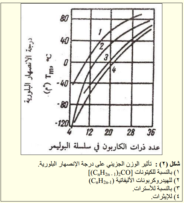 للوزن الجزيئي للبوليمر تأثير كبير على درجة الانصهار البلورية وخاصة عندما يكون منخفضا نسبياً. ولغرض تبسيط هذه العلاقة لنأخذ سلسلة من الهيدروكربونات التي تزداد اوزانها الجزيئية كما في الجدول (1).