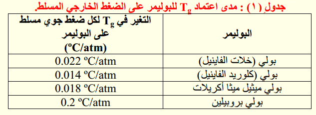* وجد بأن مقدار التغير في Tg لبولي (خلات الفاينيل) يبلغ (0.022 C/atm) لكل ضغط جو مسلط على البوليمر.