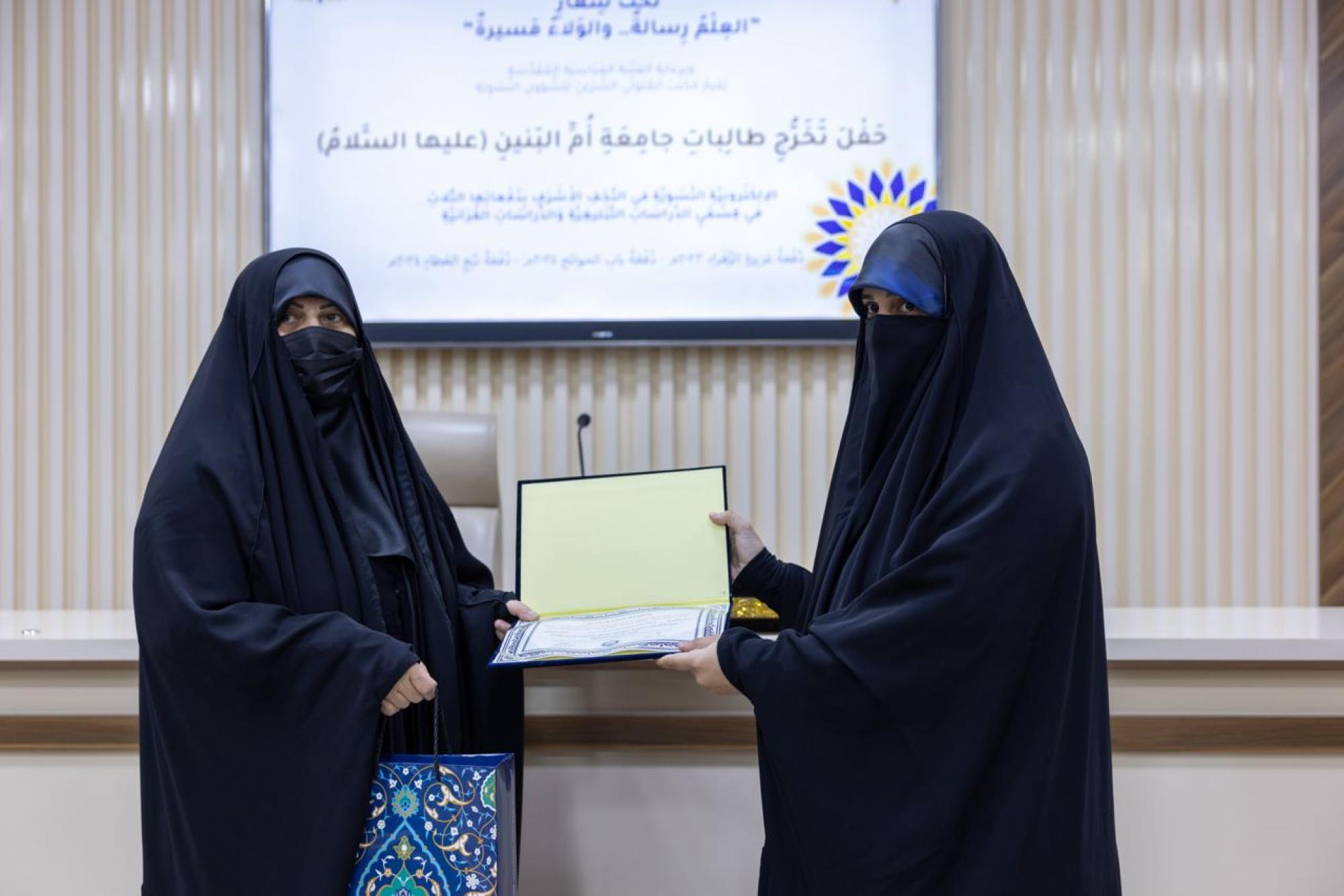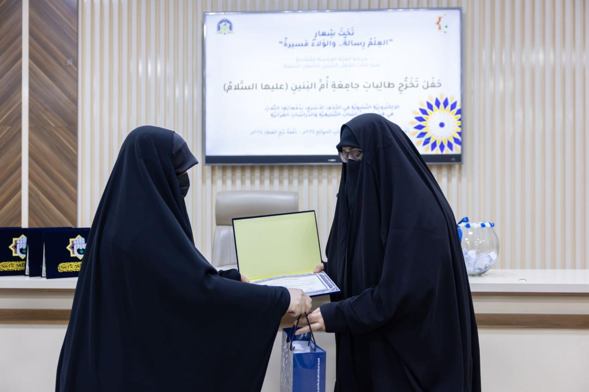 كرمت جامعة أم البنين (عليها السلام) الإلكترونية النسوية، التابعة لمكتب المتولي الشرعي للشؤون النسوية في العتبة العباسية المقدسة، الطالبات الأوائل والملاكَين التدريسي والإداري، وذلك ضمن فعاليات حفل التخرج الذي أُقيم في مركز الصديقة الطاهرة. وشهد الحفل الاحتفاء بتخرج طالبات الجامعة من دفعات الأعوام 2023 – 2024 – 2025م. وجاء تكريم الطالبات الأوائل تتويجًا لجهودهنّ المتميزة في التفوق والإصرار على بلوغ أعلى المراتب الأكاديمية، بما يُعزّز روح التنافس الإيجابي ويحفز على التميز العلمي. وشمل التكريم الملاكَين التدريسي والإداري؛ تقديرًا لدورهما المحوري في أداء رسالتهما التعليمية، وسعيهما الدؤوب إلى تطوير البيئة الأكاديمية بما يضمن تقديم أفضل مستويات التعليم والتعلم.