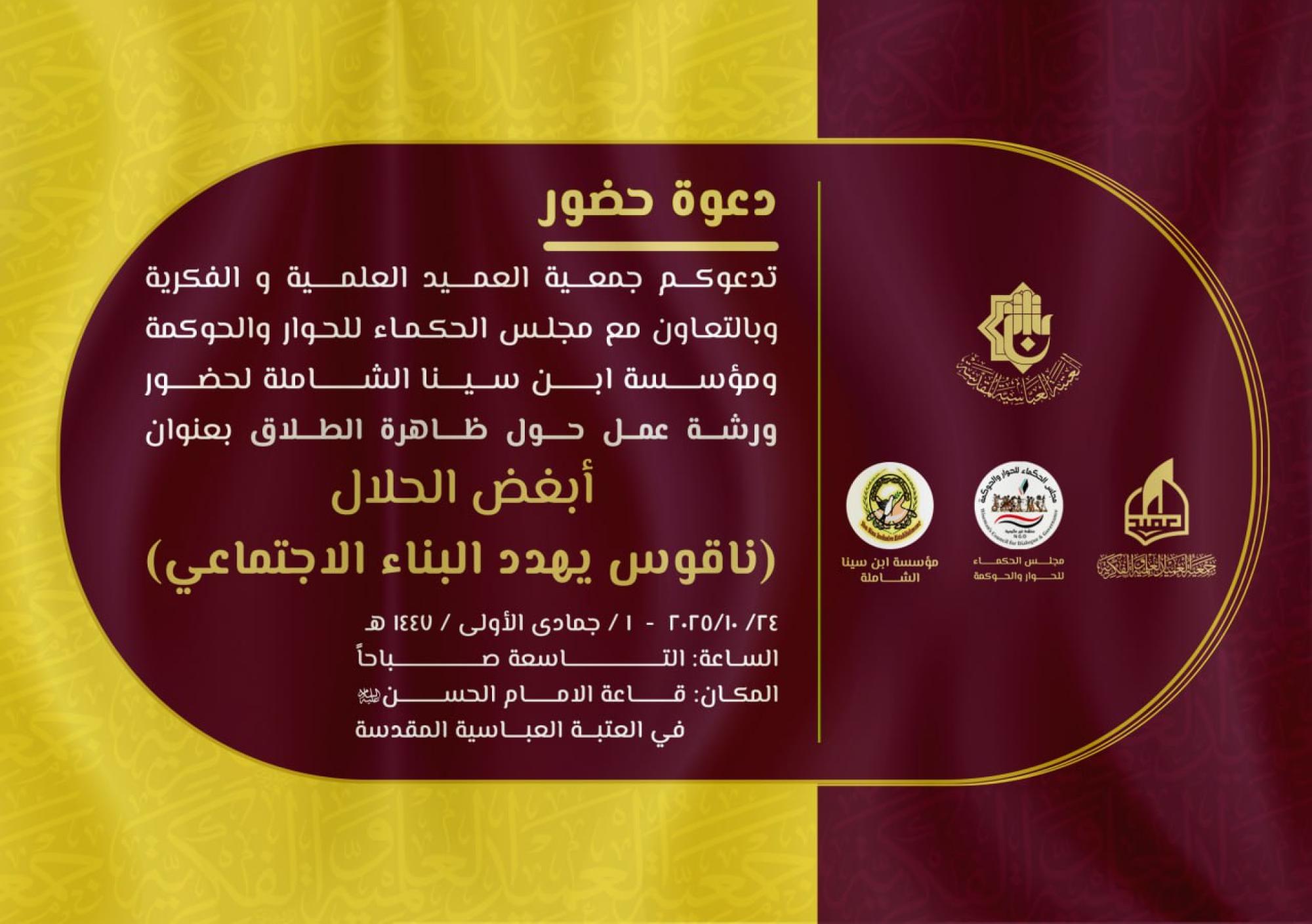 تدعو جمعية العميد العلمية والفكرية الباحثين للمشاركة في فعاليات الورشة العلمية الموسومة بـ: (أبغـض الحـلال... ناقوس يهدِّد البناء الاجتماعي). وتقيم الجمعيةُ الورشةَ بالتعاون مع مجلس الحكماء للحوار والحوكمة، ومؤسّسة ابن سينا الشاملة، برعاية العتبة العباسية المقدسة.