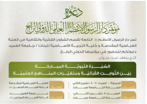 يدعو قسمُ الشؤون الفكرية والثقافية في العتبة العبّاسية المقدّسة، المهتمّين والباحثين؛ لحضور فعّاليات المؤتمر العلميّ الدوليّ الرابع، لسيرة الرسول الأعظم(صلّى الله عليه وآله). وتُقيم المؤتمرَ دارُ الرسول الأعظم(صلّى الله عليه وآله) التابعة للقسم، بالتعاون مع كلّية التربية الأساسية للبنات في جامعة العميد، تحت شعار (رَسُولٌ مِّنَ اللَّهِ يَتْلُو صُحُفًا مُّطَهَّرَةً)، وبعنوان (السيرة النبوية المباركة بين الثوابت القرآنية ومتغيّرات المناهج العلمية). وستنطلق فعّالياتُ المؤتمر يومي الجمعة والسبت (7 – 8 تشرين الثاني الجاري)، في الساعة التاسعة صباحاً، على قاعة الإمام الحسن المجتبى(عليه السلام) في العتبة العبّاسية المقدّسة. وستشهد فعّاليات المؤتمر، تنظيم ندوةٍ علمية في جامعة العميد، يوم السبت الموافق للثامن من تشرين الثاني، في الساعة التاسعة صباحاً على قاعة الإمام المجتبى(عليه السلام) في الجامعة.