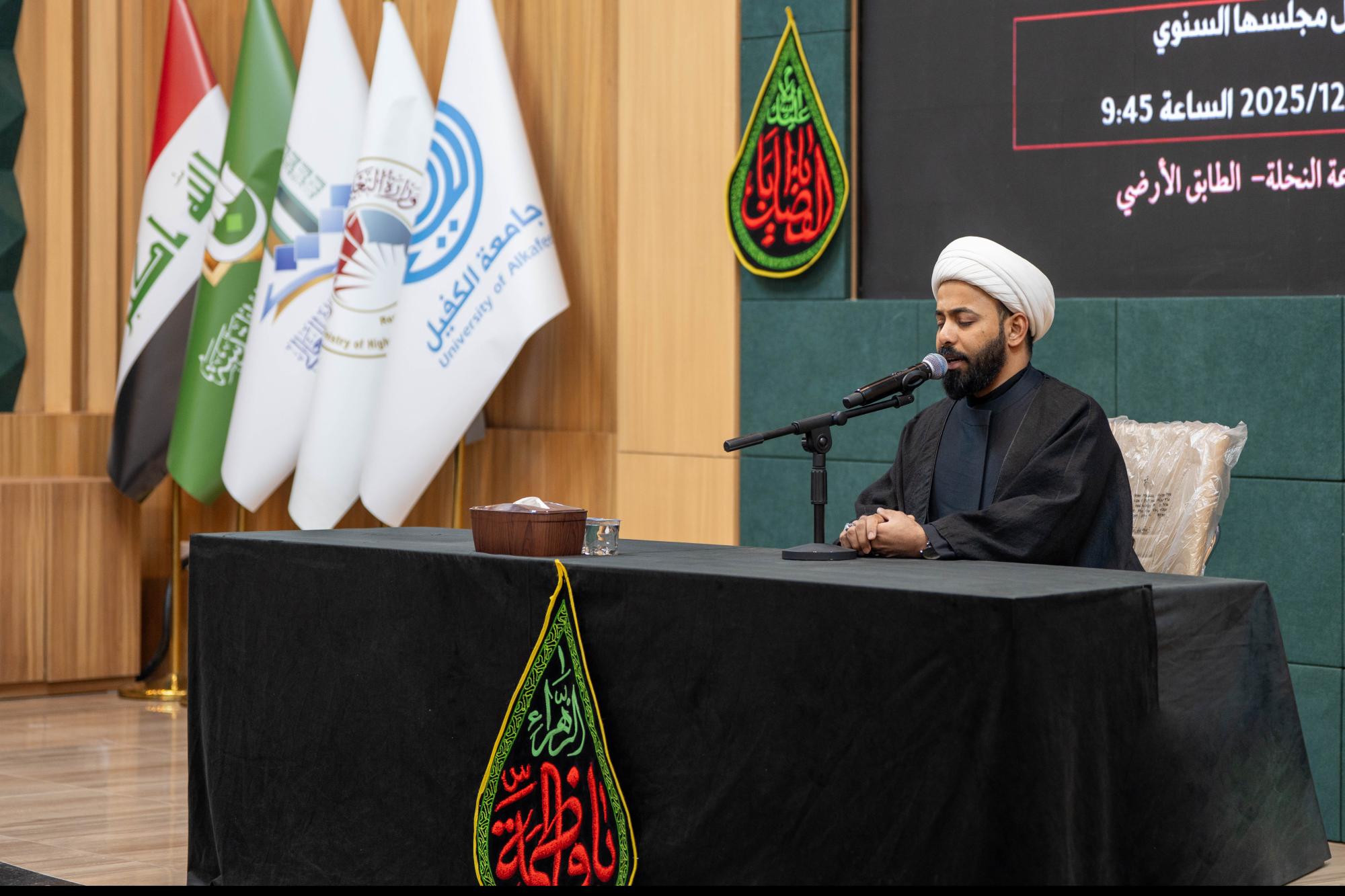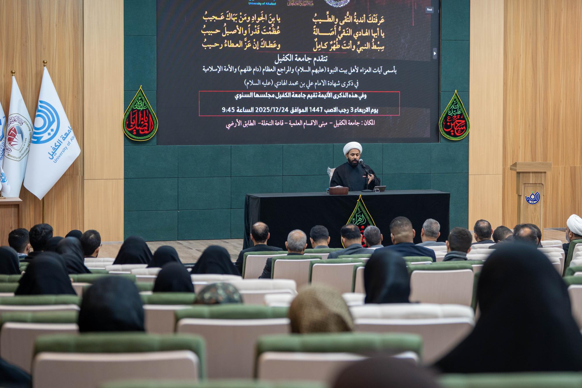 نظّم قسم الإرشاد النفسي والتوجيه التربوي في جامعة الكفيل مجلس عزاء بمناسبة ذكرى شهادة الإمام علي بن محمد الهادي (عليهما السلام). وأُقيم المجلس في مبنى مجمّع الأقسام العلمية بحضور رئيس الجامعة الدكتور نورس محمد شهيد الدهان ومساعده العلمي الدكتور نوال عائد الميالي، إلى جانب عمداء الكليات والمعاونين وأعضاء الهيأة التدريسية والموظفين. واستُهلّ المجلس بتلاوة آيات من الذكر الحكيم بصوت القارئ علي الزبيدي من المجمَع العلمي للقرآن الكريم التابع للعتبة العباسية المقدسة، أعقبتها محاضرة دينية للشيخ عادل الجابري تناول فيها محطات من حياة الإمام الهادي (عليه السلام) مستعرضًا ثباته وصبره أمام ظلم الحكام، وصولًا إلى استشهاده كما حدث مع آبائه الطاهرين (عليهم السلام).