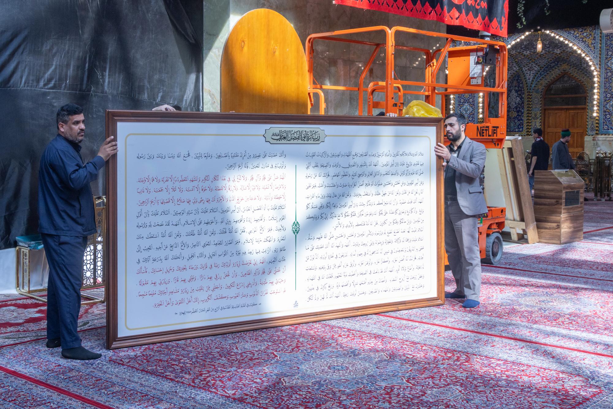 أنجزت ملاكات قسم رعاية الصحن الشريف في العتبة العباسية المقدسة أعمال استبدال اللوحات الخاصة بزيارة أبي الفضل العباس (عليه السلام) داخل الصحن الشريف. وقال معاون رئيس القسم، السيد زين العابدين القريشي: إنّ "ملاكات القسم شرعت بأعمال استبدال اللوحات الخاصة بزيارة أبي الفضل العباس (عليه السلام) داخل الصحن الشريف، ضمن خطة عمل تهدف إلى الحفاظ على جمالية اللوحات وضمان وضوح نصوص الزيارة للزائرين الكرام". وأضاف أنّ "هذه الأعمال تأتي ضمن برنامج دوري تتبناه العتبة المقدسة لتجديد اللوحات الخاصة بالزيارات والأدعية داخل الصحن الشريف، بما ينسجم مع الطابع الروحي والمعماري للمكان، ويسهم في إظهار نصوص الزيارة بصورة واضحة تليق بقدسية المرقد الطاهر".