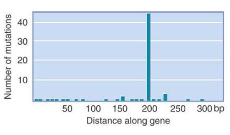 This suggests that the gene can be regarded as a target for mutation, and that damage to any part of it can alter its function. As a result, susceptibility to mutation is roughly proportional to the size of the gene. Are all base pairs in a gene equally susceptible, though, or are some more likely to be mutated than others?